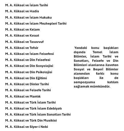 Bu çerçeve Mustafa Asım Köksal ve onunla ilintili konular haricinde aşağıdaki örnek temalar çerçevesinde bildiriler hazırlanabilecektir. Katılımcılar kendi çalışma alanlarında da bildirilerle katılım sağlayabilecektir. Bu anlamda bir kısıtlama yapılmayacaktır.